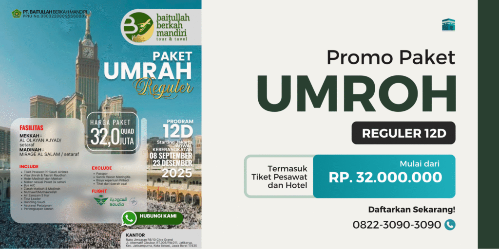 Ingin menunaikan ibadah umroh dengan harga terjangkau, fasilitas nyaman, dan bimbingan spiritual lengkap? PT. Baitullah Berkah Mandiri (PPIU No. 03032200095560002) menghadirkan Paket Umroh Reguler hanya Rp 32 juta (Quad Room) dengan program 12 hari, plus promo spesial Buy 5 Get 1 Free!